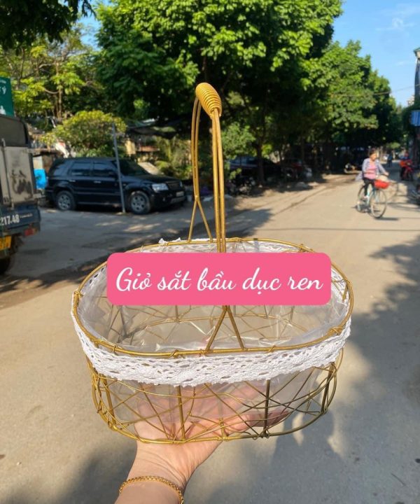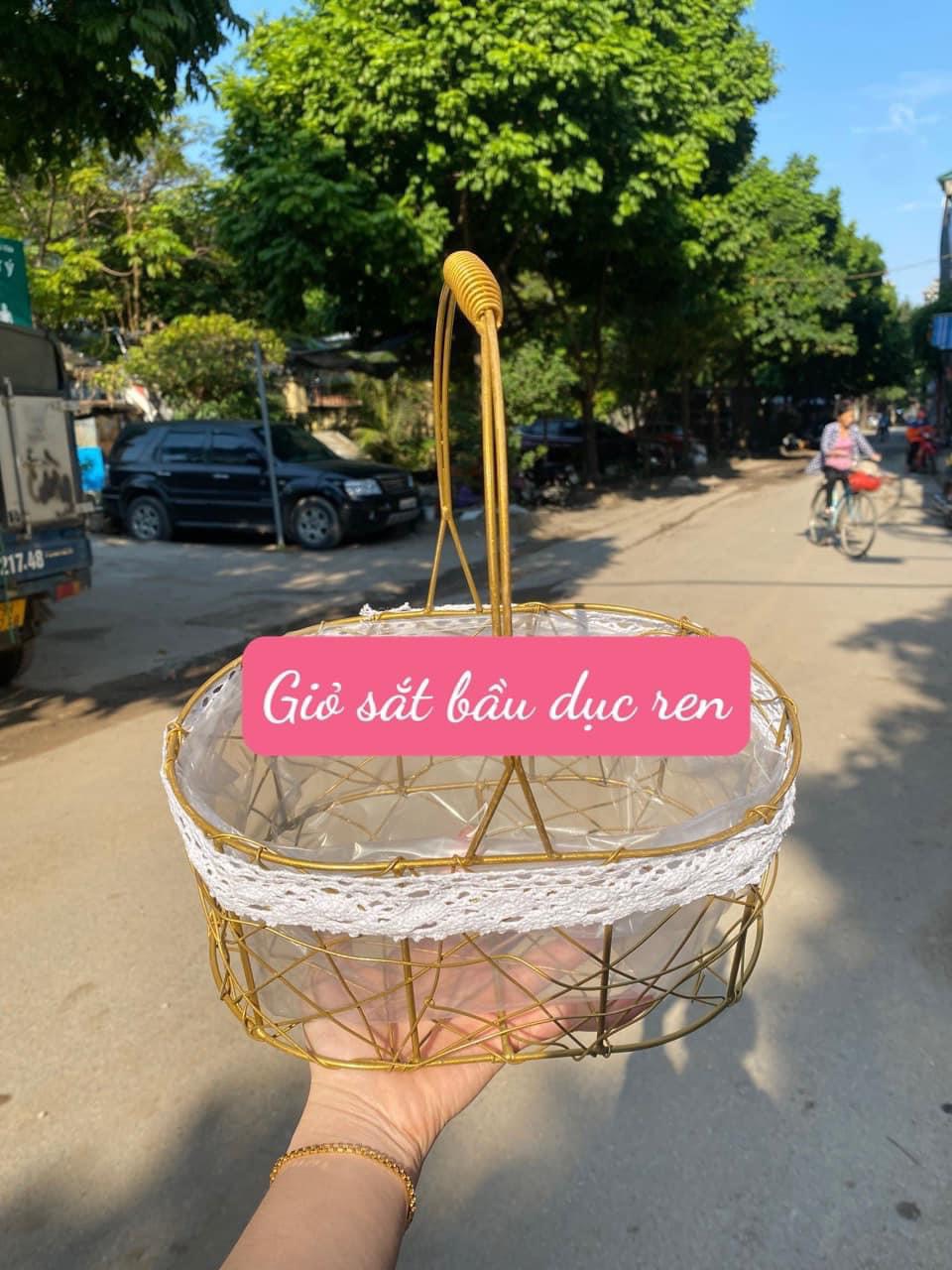 Mô tả sản phẩm: Giỏ sắt, được bao quanh lụa ren bên ngoài miệng giỏ, trong có lớp túi nilon
