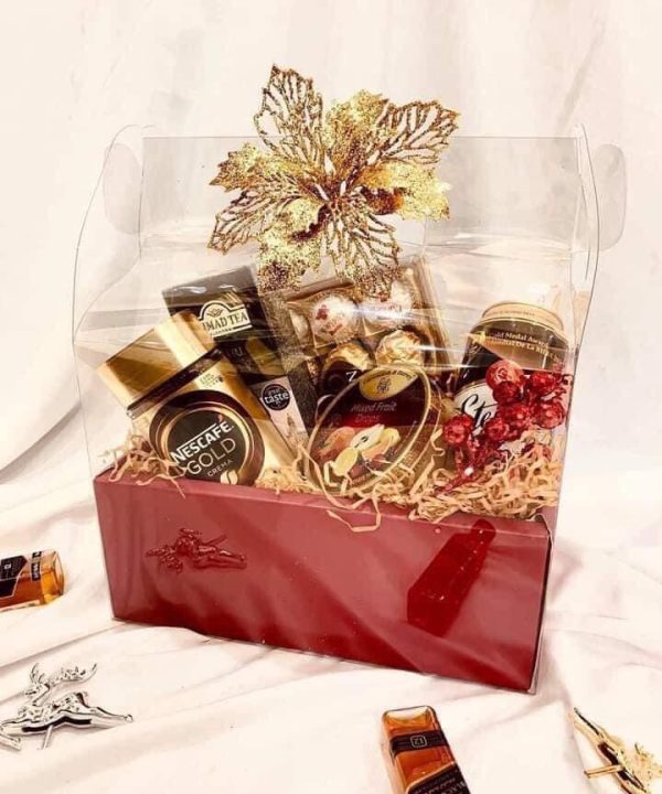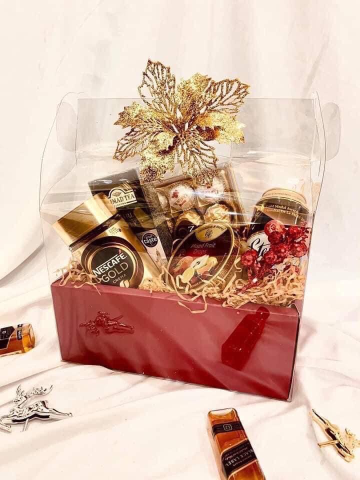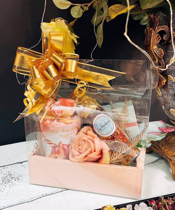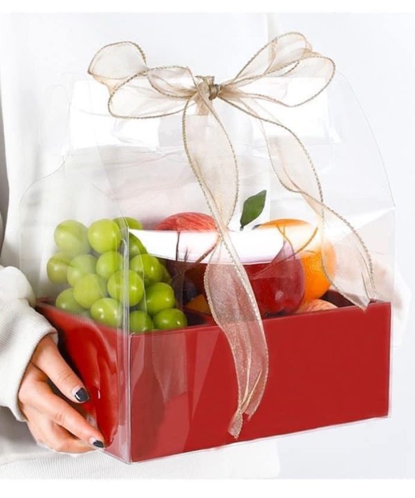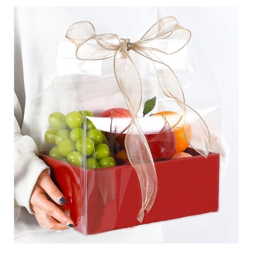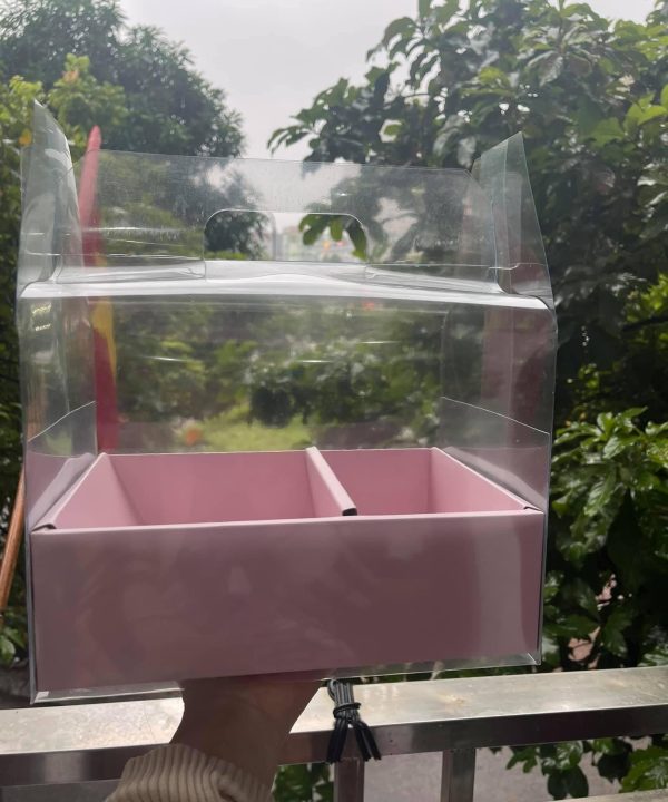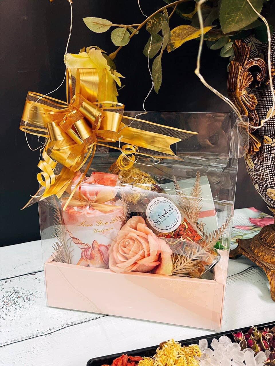 . 🎁 Hộp quà có mika và hộp giấy, được đặt trong miếng mika lớn trong suốt bên ngoài, có quai xách, thắt nơ lấp lánh rất sang chảnh.